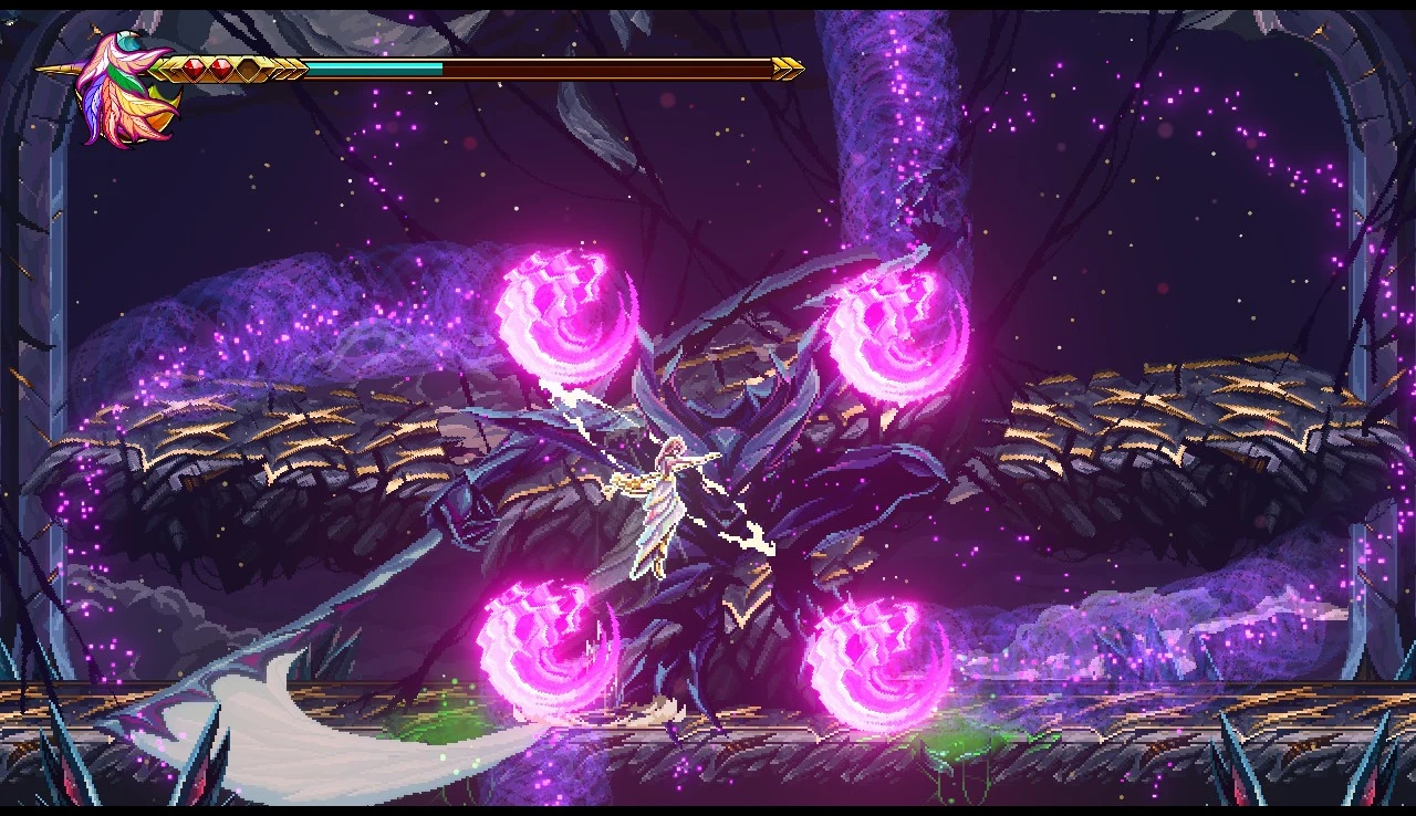 Este metroidvania comeza caracterizado por partir dun mundo en branco e negro que recupera cedo todas as súas bonitas cores logo de nove anos de sombras. Eu non preciso máis que iso e un castelo cheo de monstros para gozar un xogo deste estilo. Pero, sen ter moreas de diálogos, abundan as referencias ao mundo anterior e as súas personaxes pero contadas de maneiras vagas e misteriosas. Chegou un momento que me deixaron de interesar e saltei, por exemplo, os pensamentos da protagonista cada vez que ía en ascensor. O xogo mira moito aos Castlevanias, con semellanzas que pasan a homenaxe para se achegar perigosamente ao plaxio, pero tamén podería tomar nota de como contar máis con menos.