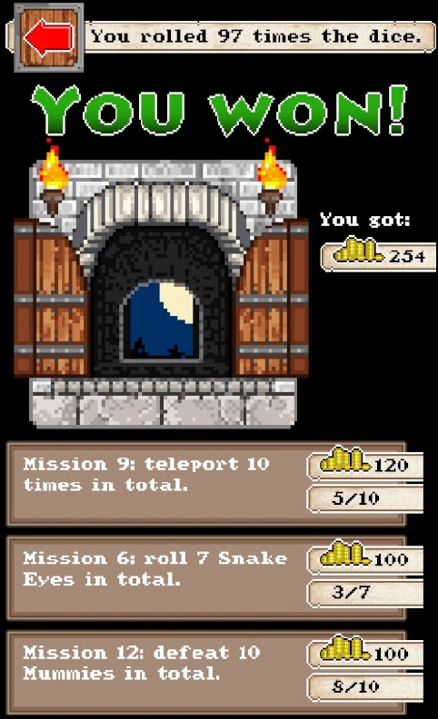 Ao comezo era máis complicado, pero tras completar cada meta-misión, ou gañar unha partida con éxito, obtemos cartos para mellorar todas as nosas futuras posibilidades. Como as táboas de encontros non cambian, isto provoca que, necesariamente os seguintes paseos polo alxube sexan máis doados. Tamén é certo que as meta-misións vólvense máis complicadas, non tanto porque esixan grandes fazañas senón porque teñen números esaxeradamente altos ou son totalmente ao chou. Unha mostra disto último foi a de atopar seis habitacións baleiras, o cal sucede cando os dados suman nove: facendo as contas de que hai un total de trinta e tres habitacións nunha partida completa sen perder, sae unha posibilidade de éxito do 8.67%, sen que poidamos facer nada para incrementalo. Certo é que as partidas son curtas, pero tamén repetitivas e pouco interesantes, así que inda que contaba con completar todos os créditos, tras tres horas decidín non lle adicar máis tempo a este limitado deseño.
