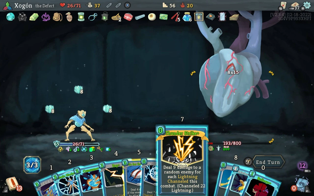 A primeira desas dez comezou extraordinariamente ben: troquei a miña reliquia inicial e tres ataques básicos por tres cartas melloradas: unha agregación, un raspar e un reciclar. Nos primeiros andares atopei sunder, streamline e rebound. Decidín investir cedo nun xeado, e dende aí o plan fíxose só. Con todo, xoguei bastante mal, con detalles como pasar a quenda sen xogar unha defensa porque non contei ben a enerxía que me restaba ou esquecer que se duplicaba a primeira carta de cada quenda en intres bastante importantes. Xa tiña unha baralla ridícula, que podía gardar e sumar ducias de enerxía antes da primeira actuación rival. Tiven que parar antes de rematar, e pasei o día seguinte pensando que ía ser complicado que funcionase contra o xefe finalísimo, pero na segunda metade do terceiro acto sumáronse moreas de tesouros que cubriron os buratos que levaba. Non era o conxunto de cartas definitivo para o corazón, porque as duascentas orbes de lóstregos que canalicei na mesma carta eran máis do límite de dano de quenda, pero aquí si que xoguei ben os naipes e, con mestría, conseguín unha vitoria en ascensión 20!