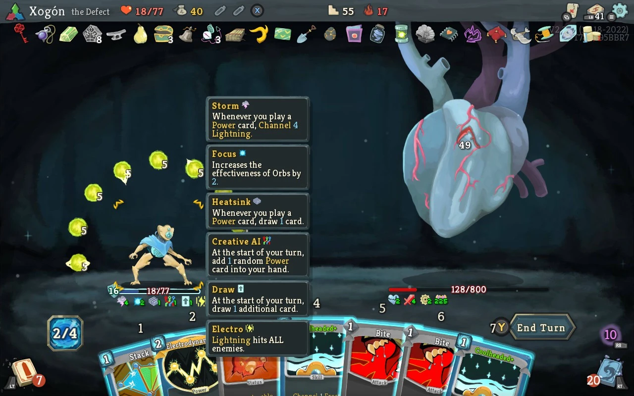 Non foi planeada a volta ao Slay the Spire, pero encaixaba ben para xogar tranquilamente sen a preguiza que me daba o Panzer Dragoon Saga nin o continuo sentimento de baleiro tras perder outra rolda no Brotato. Porque o sentimento de baleiro tras perder outra rolda no Slay the Spire pode semellar similar, pero é peor porque as partidas tenden a durar máis. De socate, sen me decatar, pasou a ser o meu xogo principal outra vez máis. Xusto falei cuns amigos que anda na ascensión do robot e que estaba a ser un pouco frustrante cando, tamén de súpeto, enlacei con el varias partidas prometedoras.