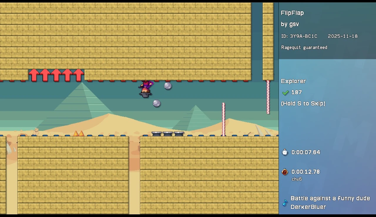Mantiven instalado este derivado do I Wanna Be the Guy na Steam Deck para xogar de cando en vez. O meu plan era arrancar o modo de exploración, no que saen os últimos niveis subidos pola comunidade, é tentar brevemente de adiviñar se tiña algunha posibilidade de completar o que me viña ofertado. O meu algoritmo interno tiña en conta cousas como o mellor tempo rexistrado, o título, o tamaño do ficheiro, a densidade de pinchos ou o meu número de mortes antes de superar o primeiro brinco (non era raro que pasara de dez e non tivese pinta de que foran a ser máis doadas as seguintes partes). Grazas ao cómodo botón de “skip” podía obter un novo desafío en cuestións de segundos antes de atopar outra imposibilidade que me faría abandonar antes de chegar sequera ao primeiro punto de control.