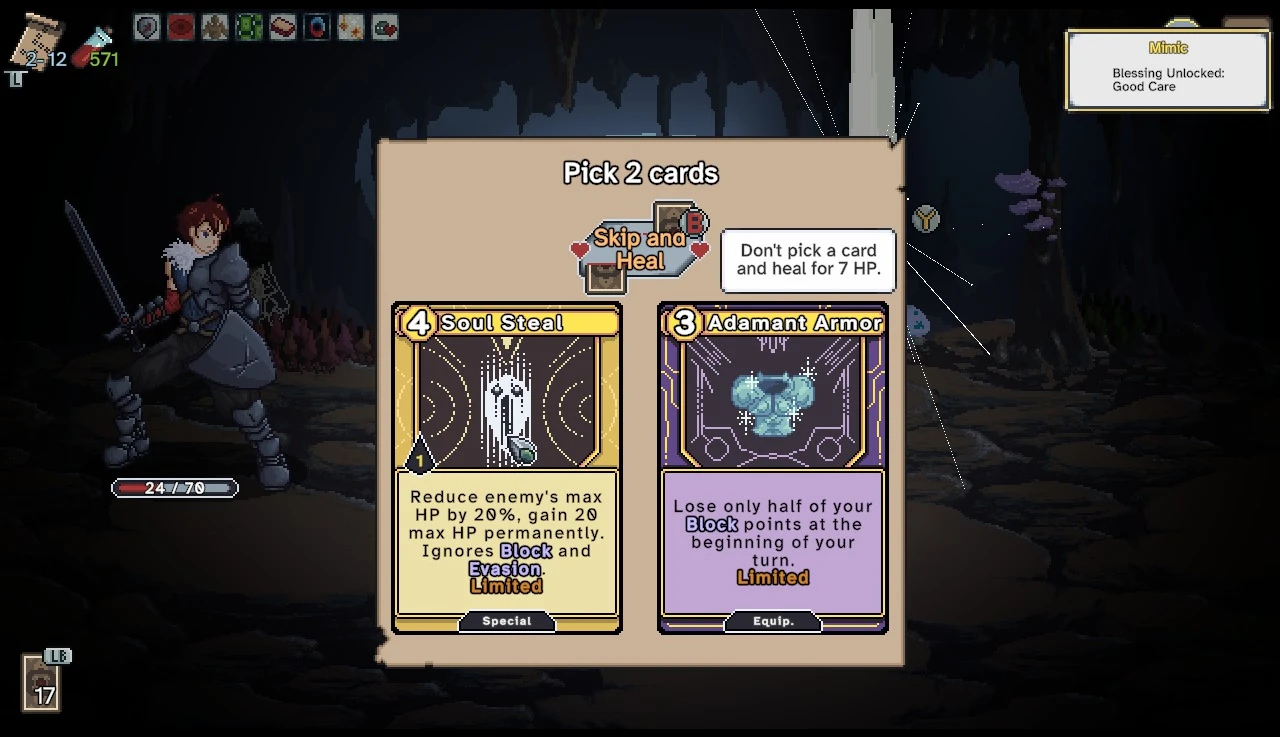 O sistema de combos esixe atención á orde na que se xogan as cartas, e tamén a ter na cabeza como troca cada unha cando é activada no seu momento preciso. Para min é demasiada carga mental, así que na miña única partida fixen o xustiño para potenciar certas cartas pero tampouco me preocupei moito de aliñalas ben. A miña sensación foi de que é unha novidade por ser novidade, e que non paga a pena o esforzo de deseñar todas as cartas con iso en mente. Quizais sexa falta de experiencia, pero penso que é máis unha cuestión do desenvolvedor agregando máis e máis cousas que un refinamento preciso. Porque na miña partida tamén atopei reliquias moi poderosas, como a que me daba 100 de bloqueo na primeira quenda, un lume onde queimar cartas sobrantes restándome vida e deixándome unha baralla case mínima, eventos que non explican o que fan (algo tamén presente no Spire nalgúns casos) de maneira que acabei cunha maldición por darlle un ataque a un gato (visto así ten senso, pero eu que sabía), dúas cartas que precisaban auga para mellorarse, pero que cando atopei unha fonte e metín unha delas non pasou nada, un ataque moi poderoso que tamén me subía a vida máxima case gratis… e un cofre con moreas de puntos de vida contra o que decidín loitar no terceiro acto e perdín por mor desas cartas mortas. Deume a impresión de que se o enfocara un pouco coma o Indies’ Lies, facendo unha baralla con poucas cartas o máis eficiente posible, tería unha vitoria clara. Pero non puiden evitar coller cartas misteriosas que foron maldicións por descoñecer o funcionamento dos seus eventos.