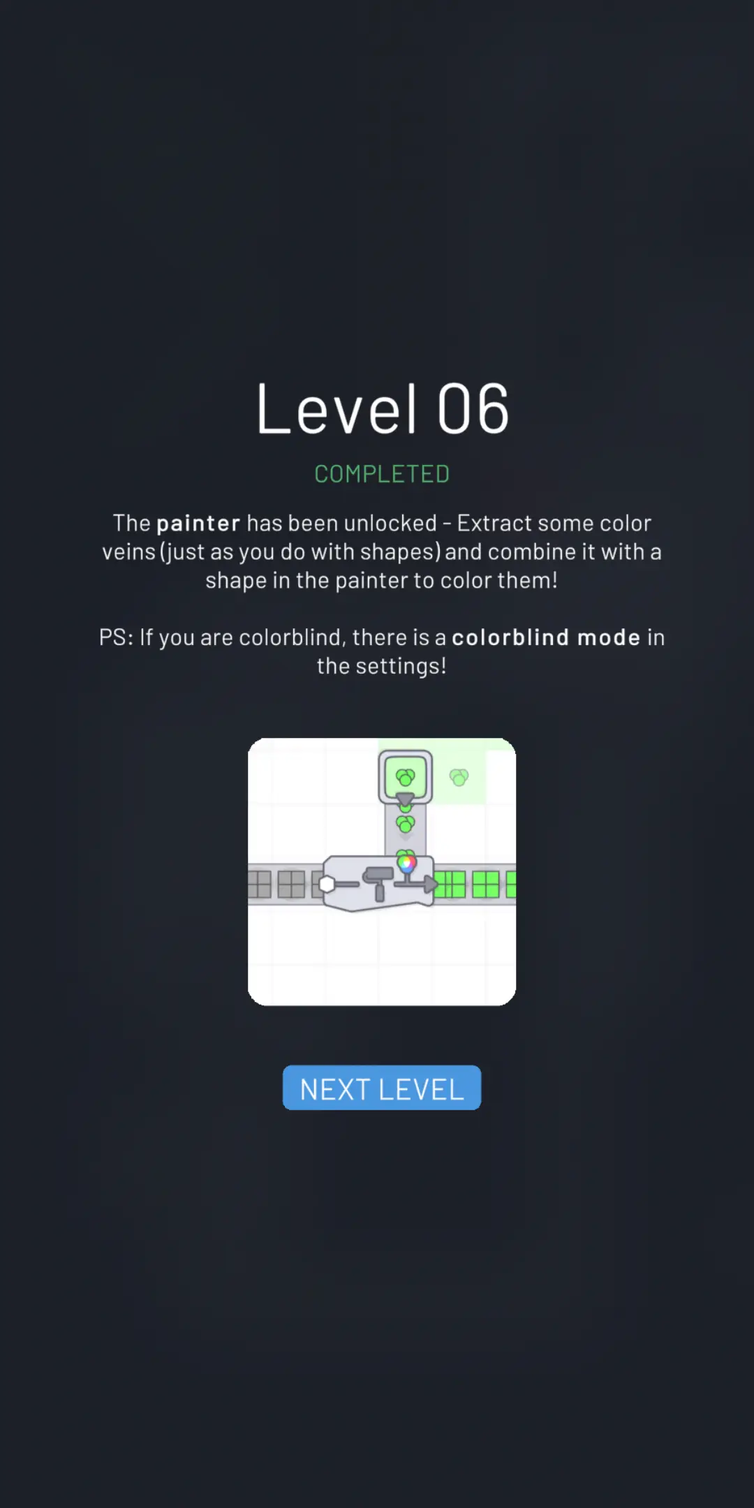 Do Factorio sei o xusto: hai que evitar uns invasores mediante máquinas, que contaminan tanto que veñen máis invasores, o que precisa máis máquinas para sobrevivir, e así ata o infinito. Soa bastante como o mundo actual, e tamén bastante estresante, polo que nunca sentín moita atracción por ese xogo. Este shapez apareceu ofertado de balde para o meu móbil, prometendo unha experiencia de construción de máquinas relaxante. Non soaba mal, ante todo o de relaxante, así que me animei a probalo. Tiña na mente o SpaceChem, ao que non xogara dende comezos da década pasada, pero que recordo máis esixente tanto nas solucións precisas para avanzar polos niveis coma pola miña teima de intentar optimizalas o máximo posible para puntuar alto nas clasificacións (coido que no primeiro puzzle fiquei a un movemento do óptimo e nunca souben por que, igual paga a pena unha revisión).