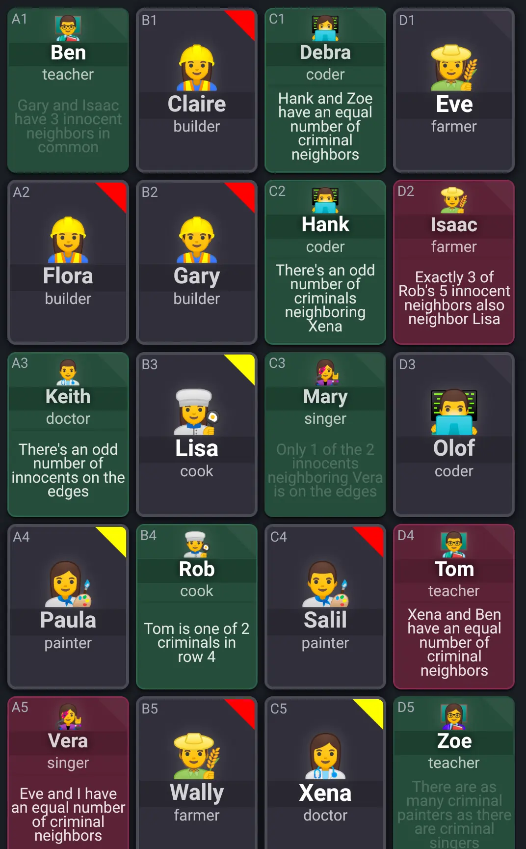 Moito crebacabezas diarios xoguei os seis meses posteriores á publicación do Wordle. Inda que non participaba en redes sociais, partillaba os resultados nun chat privado e nos daba de que falar. Valíanos calquera cousa: palabras, números, cancións, xeografía… O único nexo común era que saía un novo desafío cada día e que tiñamos algunha maneira de comparar os resultados. Co tempo, a vida volveu ao seu lugar e perdemos o costume, primeiro de seguir comparando e logo de seguir xogando. Nunca fun moi seareiro dese tipo de deberes de ocio (motivo polo que parei o Hearthstone uns anos antes, por exemplo), así que tampouco chorei pola perda. Agora atopei este Clues by Sam e, inda que non partillo os resultados, caín outra vez nas fauces do xogo diario, polo menos durante un total de tres semanas espalladas, nas que me adiquei a derivar se cada personaxe era inocente ou culpable en base ás pistas ofertadas.