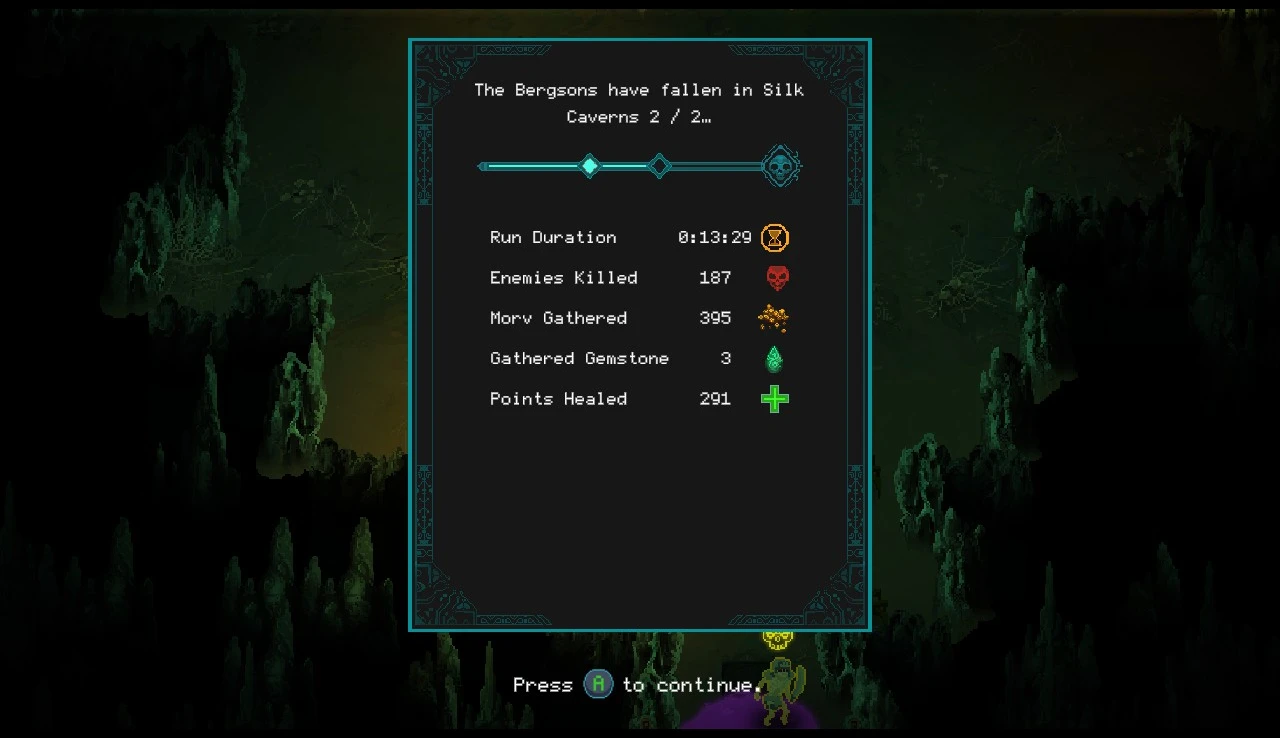 Grazas ás súas frechas, conseguín chegar varias veces a araña que fai de primeira xefa. Foron varios fracasos, pero con insistencia, práctica e melloras permanentes acadei o buscado éxito, podendo acceder á seguinte parte do alxube. Era máis do mesmo, pero os inimigos tiñan máis vida e facían máis dano. Os novos personaxes eran tamén corpo a corpo e non me interesaban, polo que rematei baixando a dificultade ao nivel normal, superando por moito os niveis onde estaba atracado e bloqueándome de novo nos seguintes desafíos. Quedoume bastante por descubrir, pero confirmei que este xogo non é actualmente para min.