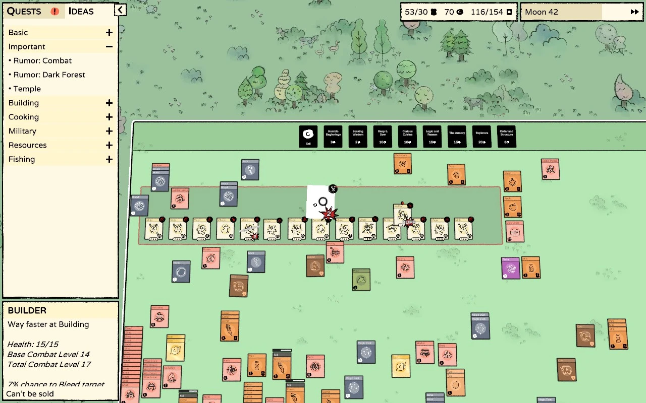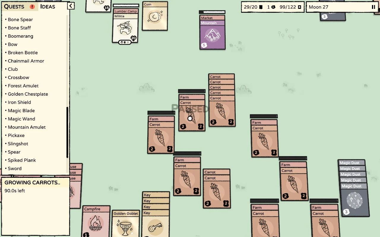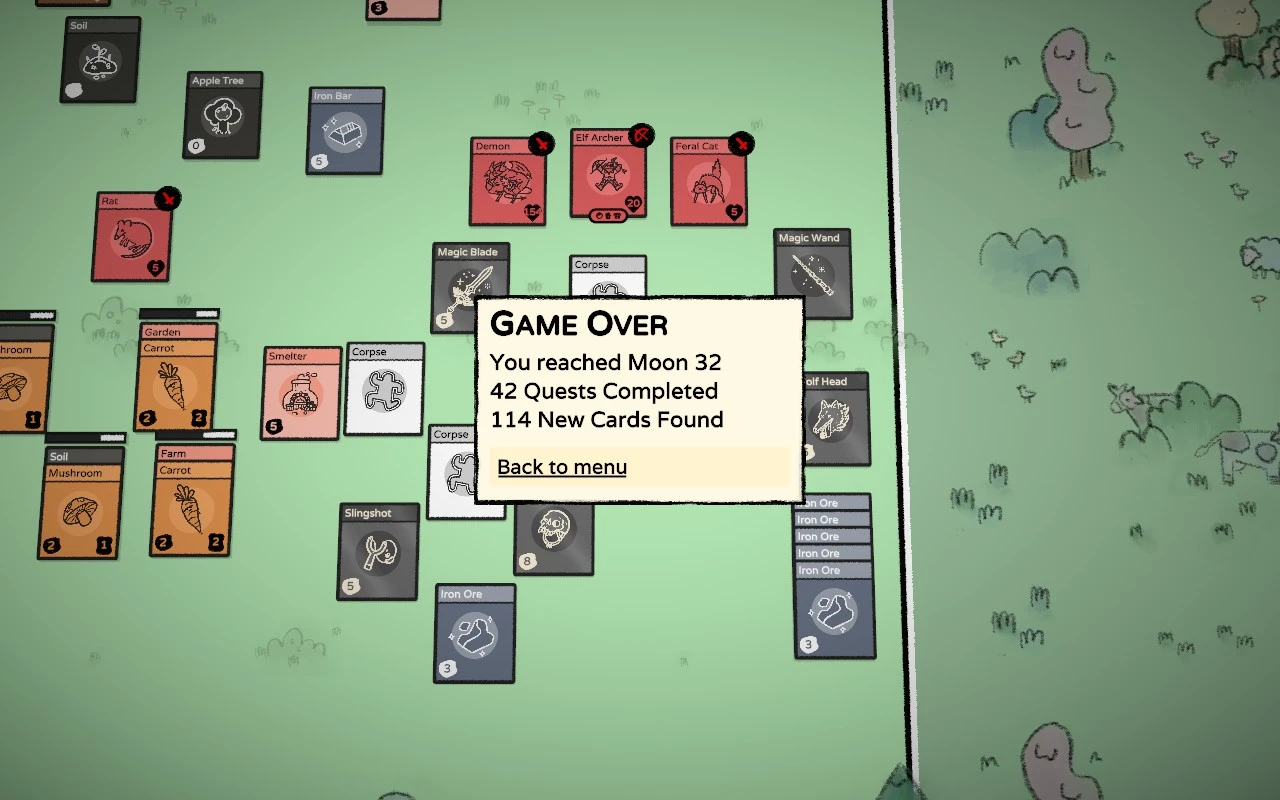 O día seguinte, como bo adicto, non me daba chegado o intre de volver xogar. Pensei ben o plan, que basicamente era sobrevivir a base de cebolas cenorias, e comecei máis centrado que nunca. Esta vez era máis doado, non só pola miña experiencia, senón porque as “ideas” de combinacións que xa atopara na anterior partida estaban presentes e non aparecían ocupando espazos das outras cartas directamente útiles. Así e todo, tiven un par de sustos pola comida pero nada catastrófico. Apañeime para ter preto dunha decena de traballadores ben equipados para as loitas. Algún perdín contra a bruxa, pero o xefe final non puido facer moito contra o meu exército. Vitoria!