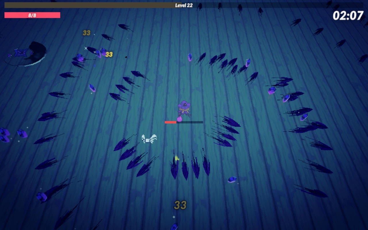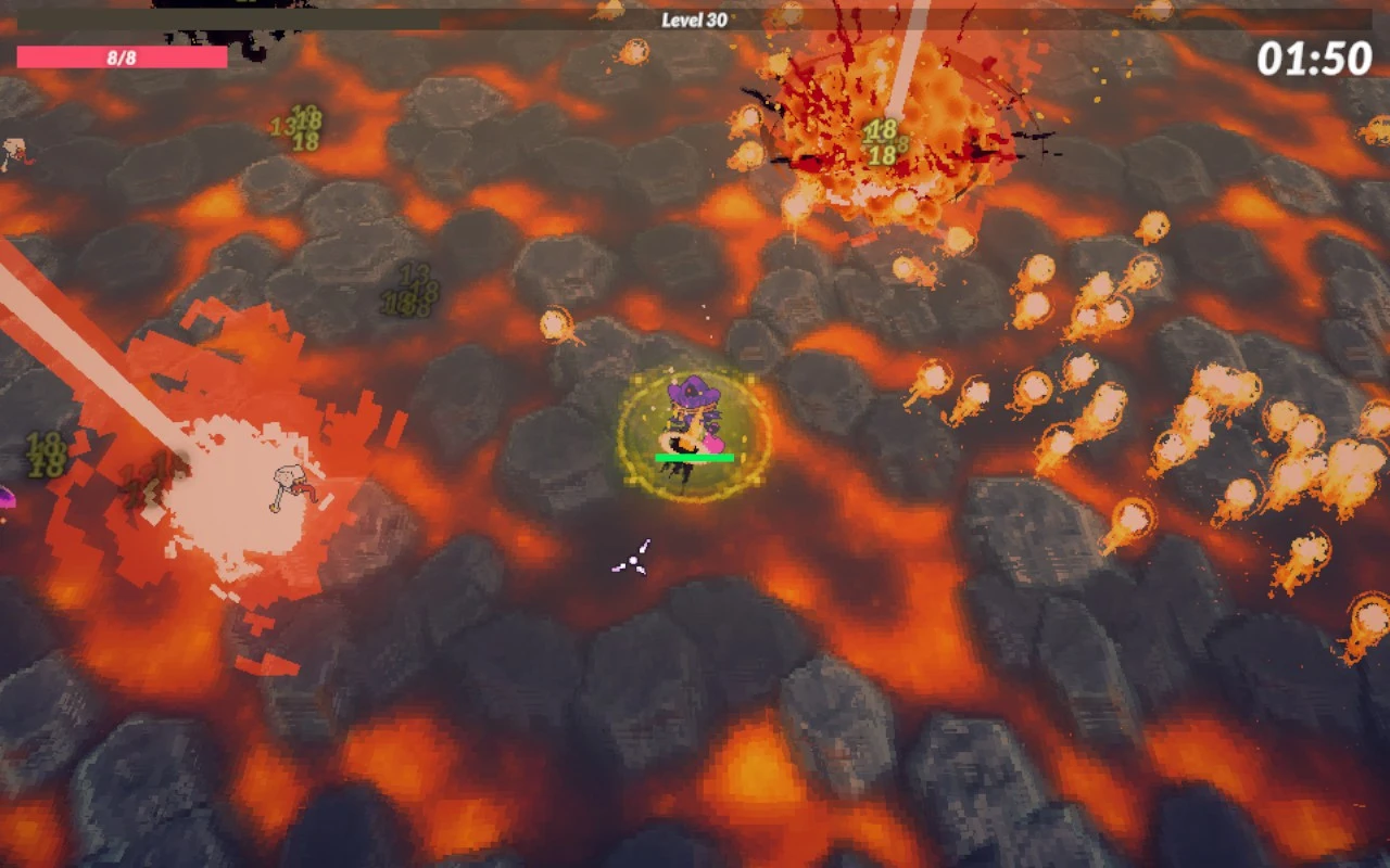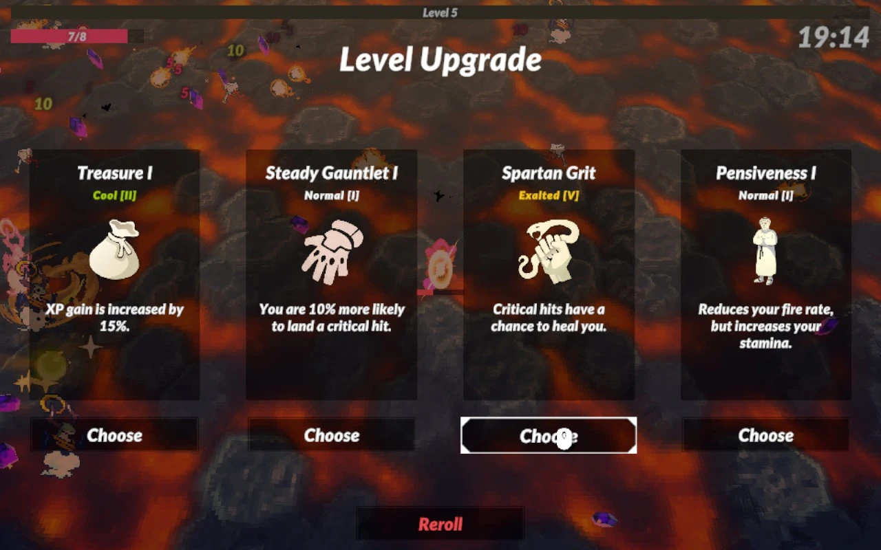 O caso é que atopei outro xogo derivado do Vampire Survivors pero máis sinxelo e peor feito. O primeiro que chama a atención é que hai que premer un botón para disparar, o cal ten certa lóxica porque hai integrada unha barra de cansazo e igual queremos parar de cando en vez. Falso. Non atopei ningún caso no que non sexa máis eficiente, e cómodo, manter o botón apertado constantemente. Logo de matar algúns bechos, subiremos de nivel, onde poderemos obter, por exemplo, melloras para os nosos ataques elementais ou cando facemos un crítico. Que non temos ataques elementais ou posibilidades de crítico? Pois nada, esas opcións non serven para nada. E hai moitas condicionais dese xeito que non compensan escoller sen os prerrequisitos, porque non sería a combinación definitiva inda que apañemos despois o que a provoca. A excepción é o que fai que os críticos poidan rexenerar os puntos de vida, peza fundamental para obter vitorias nos niveis máis elevados. Inda que é unha mellora de rareza alta, pode aparecer tan cedo como na primeira subida de nivel, e tampouco semellar ser tan infrecuente como pode parecer.